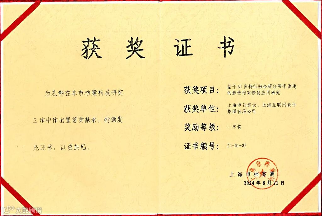 近日,上海市档案局正式公布了2024年度上海市档案科技研究成果奖获奖名单,由上海市档案馆、上海互联网软件集团有限公司共同承担的项目《基于AI多特征融合超分辨率重建的影像档案修复应用研究》,获得了上海市档案科技研究成果奖一等奖。