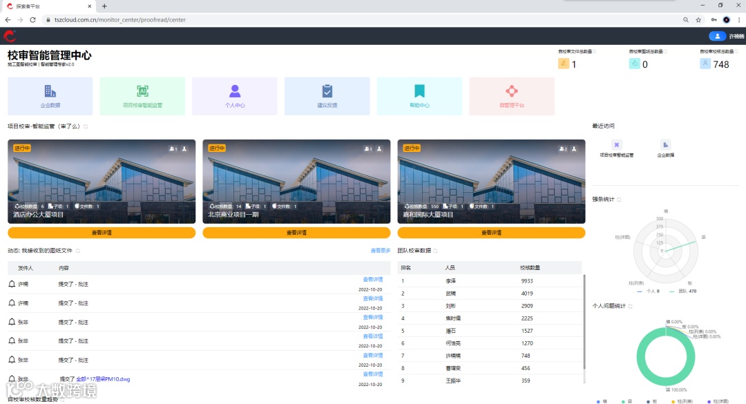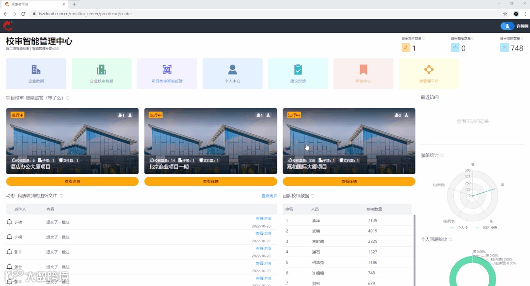 可提供自审关键数据概览、项目监管概览、查看校审动态、校审趋势可视化分析、校审批注排行、个人问题统计、强条统计、快捷入口导航。