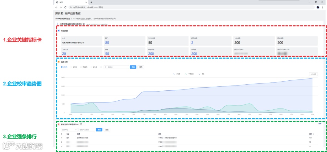 企业智能管理直观的展示了企业校审的关键指标、企业校审的整体趋势和企业校审强条的相关情况,并提供进一步详细的企业数据分析功能。