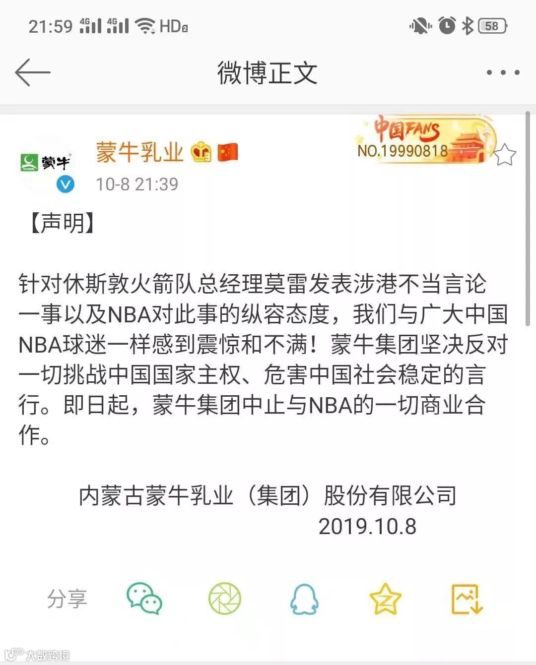 39),蒙牛在微博上发声明,中止与NBA的合作。