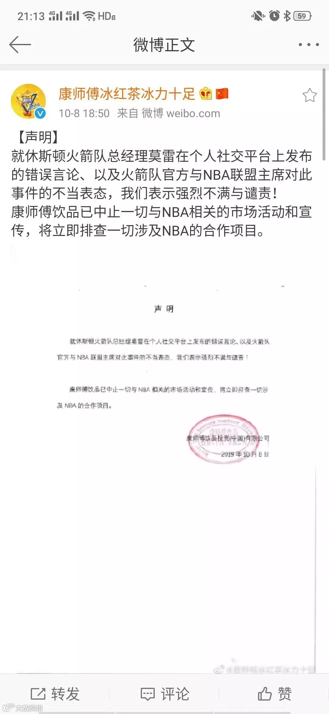 50),康师傅在微博上发声明,中止与NBA的合作。