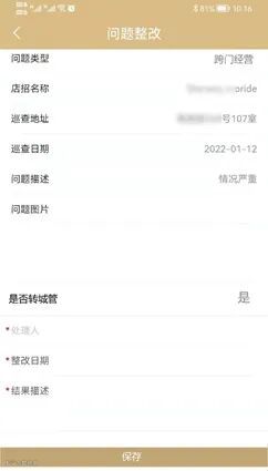 主要是对街容店貌管理中,特别是日常巡查中遇到的需要转交给城管部门处理的问题,形成问题单转发至城管部门,形成与城管部门的联动。