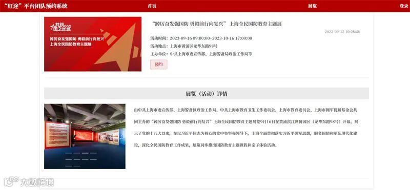 团队参观者可以通过“红途”平台电脑端(https://hth5.shshxc.cn/tuanyue/)进行“团队参观预约服务系统”,在“展览-预约”功能中,预约团体参观。