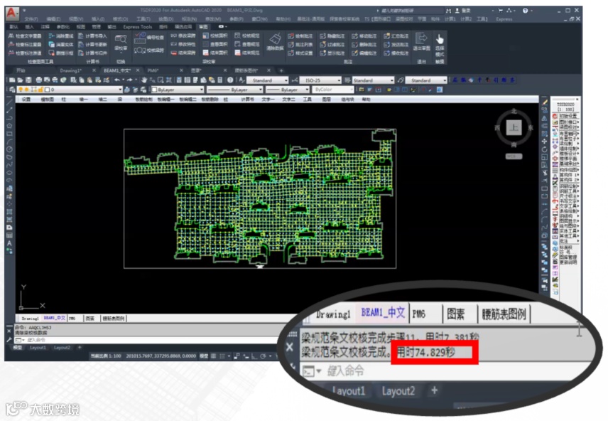 30幢楼 5万㎡ 的一个小区地库,3000多根梁平法施工图进行全部结构相关规范条文审查只需要 74.8s。在实际项目应用中,可将审图效率提升至 60% 以上。