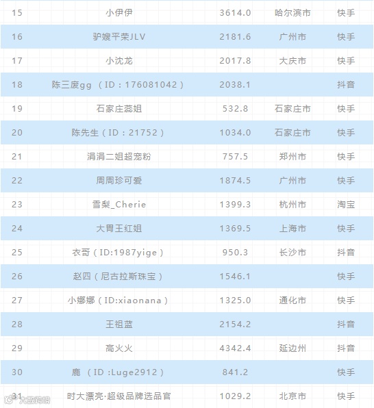 淘宝直播、抖音和快手三大平台上主播地区分布相对集中且“南抖北快”特点,平台之间头部网红的争夺也明显。