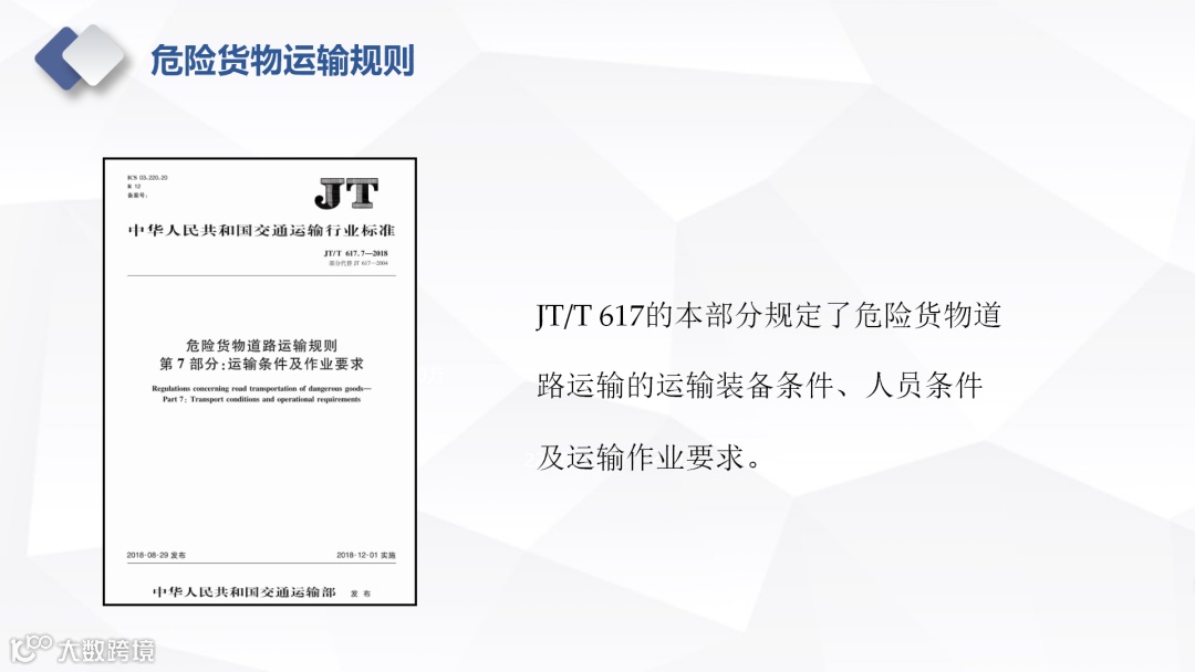 JT/T 617的本部分规定了危险货物道路运输的运输装备条件、人员条件及运输作业要求。