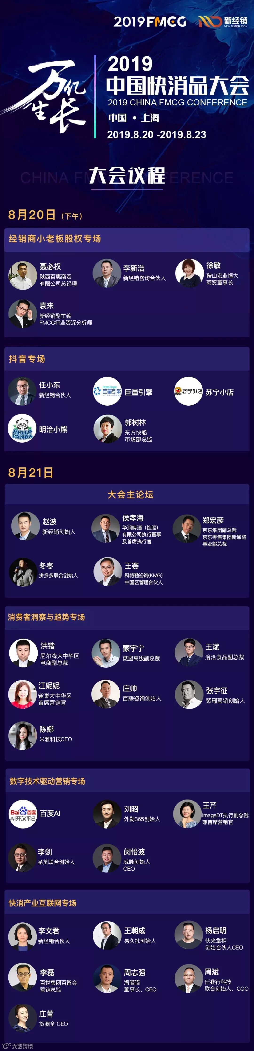 PS:2019年8月20日-23日,一年一度由新经销举办的快消品行业盛会「万亿生长·2019中国快消品大会」即将在上海震撼开启!100余位重量级分享嘉宾,4000+快消行业从业人员,18场重磅议题。本届大会以“万亿生长”为主题、“创新产品、创新渠道及创新营销”为话题,发掘新时代下支撑企业未来十年快速增长的新模式,新方法,新趋势。