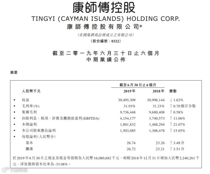 8月26日,康师傅公布2019年上半年经营业绩显示,康师傅上半年收入304.95亿元人民币,收益同比下降1.62%,毛利润达97.36亿元人民币,同比增长0.58%,归属股东溢利15.03亿元人民币,同比增长15.05%。