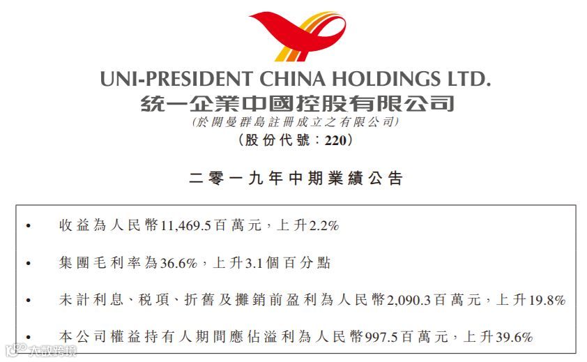 统一公布了2019年半年报,据财报显示,2019年上半年统一收益录得114.70亿元人民币,较去年同期上升2.2%。净利润同比增长39.6%,达到9.98亿元人民币。而毛利上升11.7%,达41.95亿元人民币;毛利率则上升了3.1个百分点至36.6%。