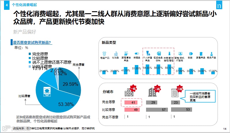 第三个问题是新品崛起,快消新品迭代非常快,包括个人护理、包装和服装这一类很多的销售都是新品驱动的,上个月我们到天猫去看,天猫在若干品类里面增量有一半以上是新品增量,不停的在推新的SKU拉动消费者的消费,这也是非常典型的特征。