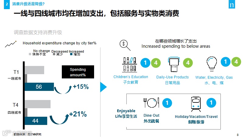 这是我们自己普调的数据,我们可以看到不管是在一线还是四线城市,其实整个家庭支出增长的人数是非常多的,缩减非常的少。那么也可以看到在整个的上线城市里边,大家在子女教育、享受生活服务型的支出里面大家都在增加投入,在整个下线市场消费者更多的在日用品这样的品类里面增长,可以看到一些社交平台上在卖一些非常便宜的东西。