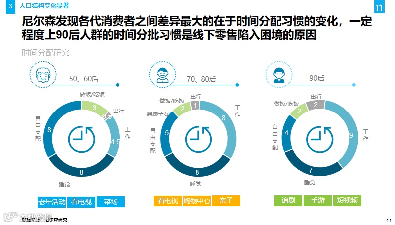 但是反过来看60后、70后、80后的时间,他们会把线下的场景作为自己安排休闲时间非常重要的分配,这样的趋势仍然会给线下零售带来非常大的压力,家庭的采购决策人90后起来之后,他们已经慢慢的没有去实体店的习惯了。