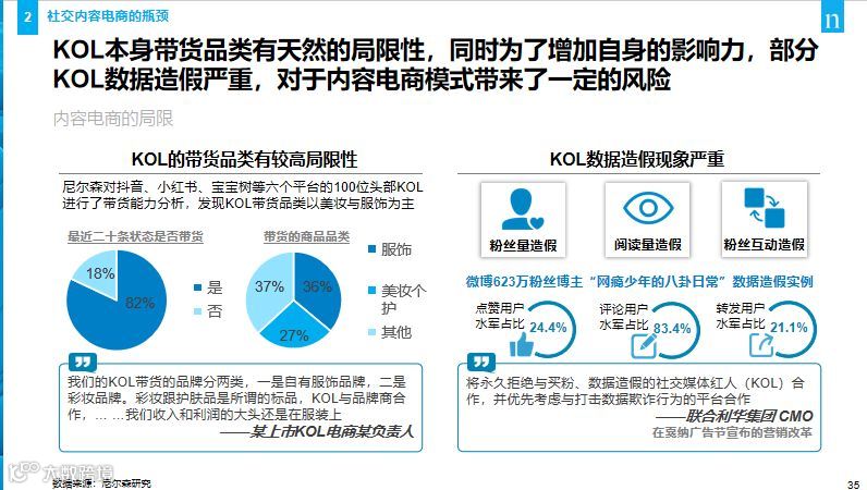 当然这里面会有问题,因为这个模式也会带来一定社交的非常典型的特点,就是它销售品类的宽度并不是很宽,我们之前在整个市场调研下来,适合KOL带货的大概七成是美妆、个护和服饰类的,而且从整个回报率来看这三个品类也是最高的,其他的品类也是比较弱的。
