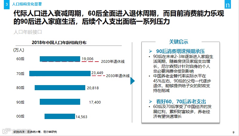 人口的变化,中国人口缩减的速度还是挺快的,70后、80后是一个人口高峰,00后其实是在缩减。我们也认为90后最近比较是一个好的消费时间点,刚刚就业,没有太大的工作压力,父母还能给不少的支持。