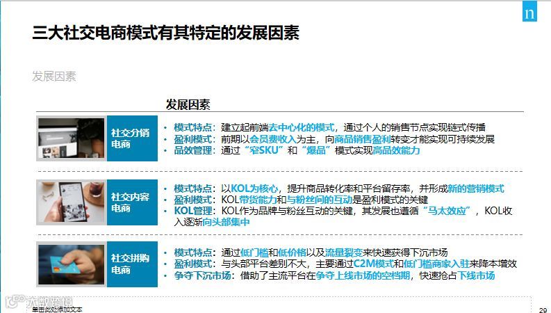 在消费者驱动之下,社交这块非常火的一个点。我们也看到社交其实并不是个新的事物,在中国过去有太多的社交,甚至有的人五年十年前就在尝试,为什么现在这么火?我们把它分类,分销社交包括内容社交包括拼购,消费者已经不太通过社交裂变去拼了,很多直接打开APP去拼。