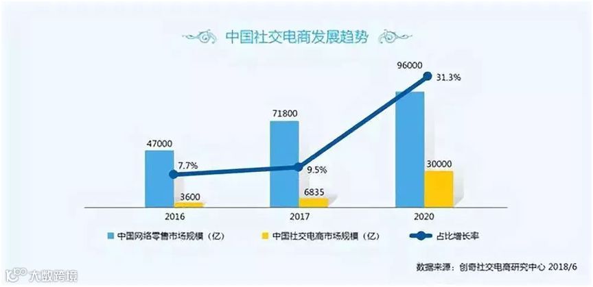 不仅如此,商务部还预计2020年中国网络零售市场规模将达9.6万亿元,而届时社交电商市场规模预计将达3万亿,对整体的占比达到约1/3。[7]俨然有望在线上渠道里“三分天下”的社交电商,规模也不可小觑。