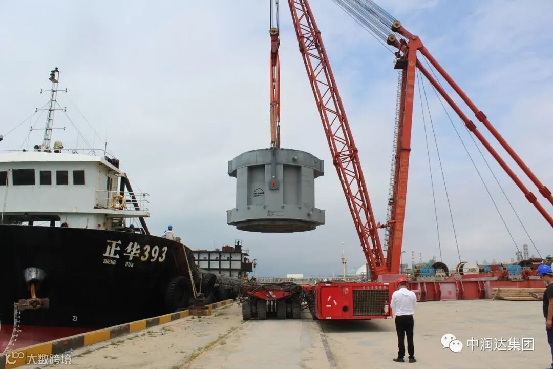2020年5月29日上午8时55分,正华393号大件运输船承载惠州宇新新材料有限公司(以下简称“宇新新材料”)482T反应器中心及相应小件设备靠泊惠州LNG码头。码头现场桅杆吊、汽车吊、轴线车、平板车、叉车等机械设备提前就绪,准备卸船运输。