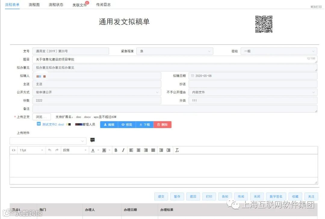 3、支持表单上二维码应用:表单设计带有二维码唯一标识,跟随流程一直流转,可直接打印,通过二维码进行分享分发文件。通过产品APP的扫码功能,可以对打印出来的表单进行验证,确保纸质文件与电子文件完全一致,提高工作效率的同时保证安全性。