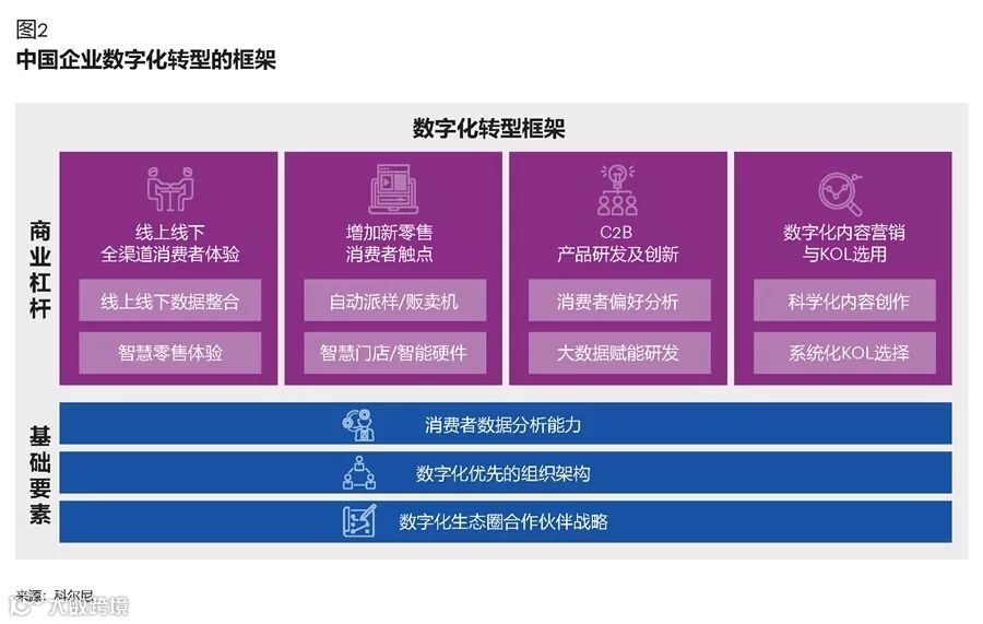 为了帮助企业在数字化转型浪潮中站稳、站久、站在前列,科尔尼构建了助力企业数字化转型的框架:由商业杠杆来实现对业务的撬动,由基础要素为企业的转型保驾护航。