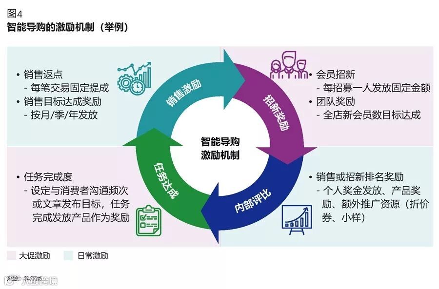 其中,合理的导购乃至销售团队激励机制是消除线上线下冲突、促进协同的关键,比如对于通过智能导购工具和导购绑定的消费者,在一段时间内发生的线上或线下消费,都计入到导购的激励或提成中。