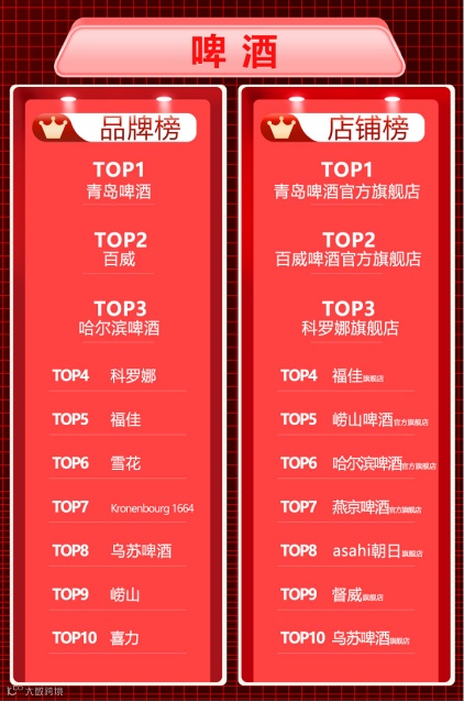 夺得天猫啤酒品牌、店铺双榜冠军;