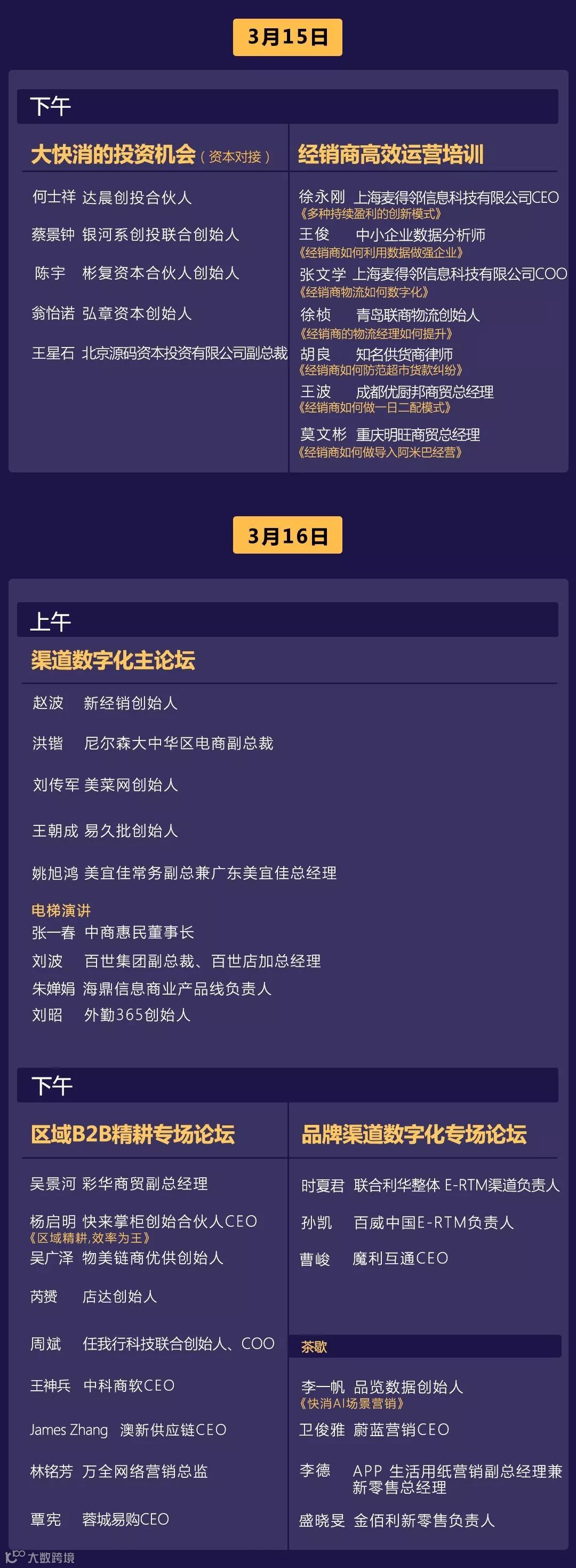 相较于往届会议,本次峰会将全面升级,除原有的渠道创新、城配物流、经销商转型等话题以外,还新增了新营销案例、IP+快消赋能、社区团购、创新零售等多场平行论坛,通过三天十场高密度高质量的专家分享交流,相信每个品牌商、经销商都能够学习到最新的商业模式,专家观点,落地的方法,为自身2019年破局找到新工具和方法,重回高速增长的轨道。