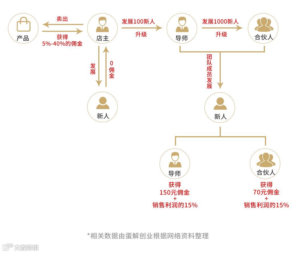 店主发展新人没有佣金,但每卖出一件商品能获得5%-40%的佣金,大部分商品的佣金能达到20%。成为导师后,团队成员每发展一名新人,导师都能获得150元的佣金;成为合伙人则能获得70元佣金。导师和合伙人还有团队销售利润15%的提成。