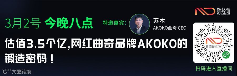 PS:今晚8点,新经销创始人赵波将连线AKOKO曲奇CEO苏木先生就《估值3.5个亿,网红曲奇品牌AKOKO的锻造密码》话题开启微信直播,和您探讨估值3.5个亿的网红品牌是如何发展的。