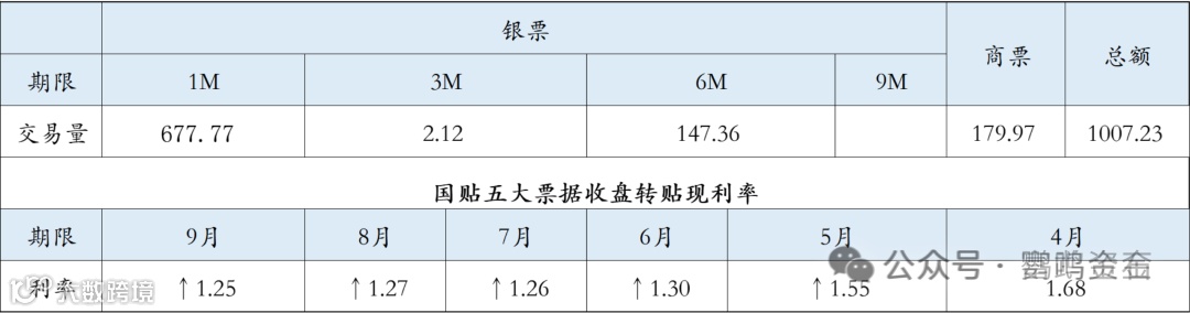 交投意愿:今日票据利率震荡微升,6M双国尾盘收于1.24%。月初第一天,票据交投清淡,成交以托收为主。6M双国卖盘上午一度出价于1.2%,但收口较少,之后买盘提价,6M双国成交于1.25%附近。午后,买盘减少,6M双国票据利率上行约1bp至1.26%收盘。从成交结果看:除农商行净买入超36亿外,其余机构成交仅个位数。