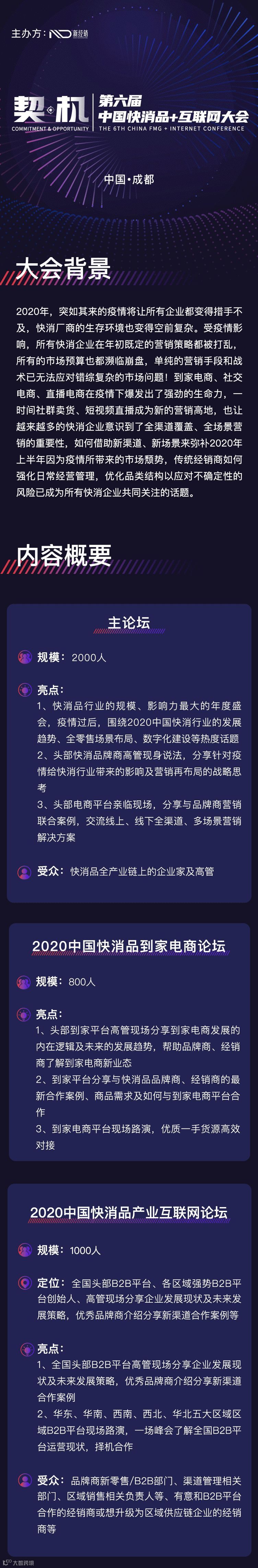 基于这些问题,我们将于5月中下旬在成都举办2020(第六届)快消品+互联网大会。本次大会以“契·机”为主题,希望通过头部快消品牌、知名行业专家和优秀经销商的分享案例,帮助大家了解到中国快消品行业正在发生的变化。