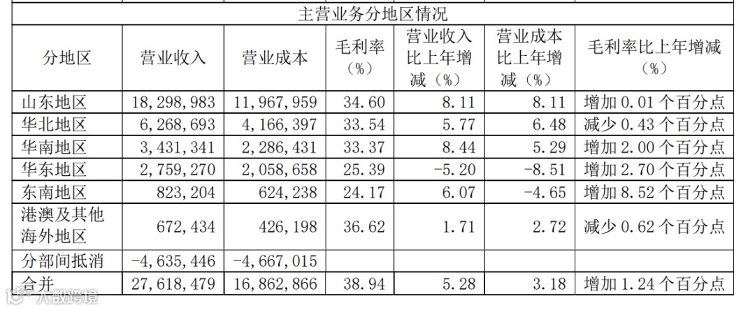 东南地区毛利率较去年同比增加 8.52 个百分点,主要原因为2019年度东南地区产品及价格链优化所致。