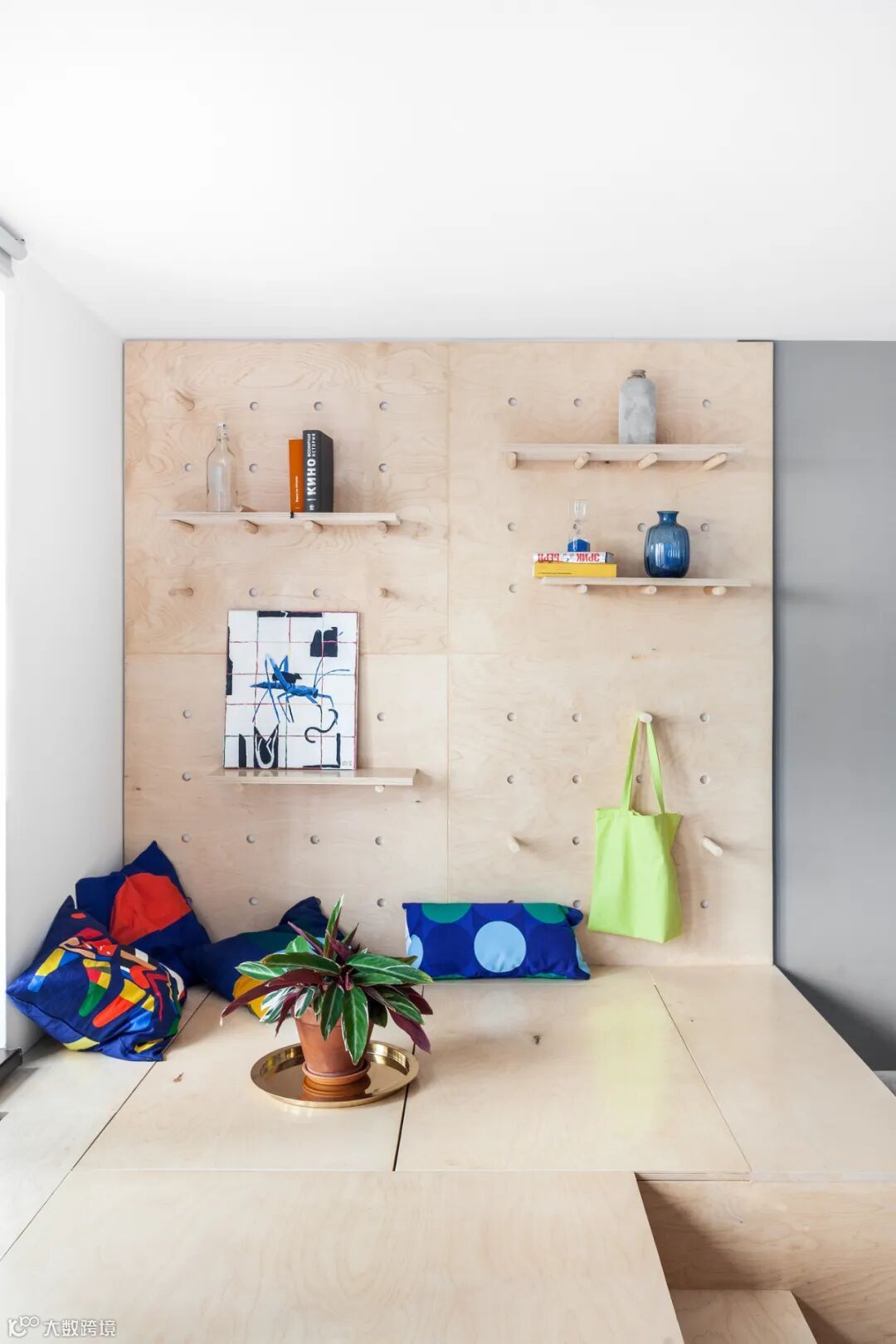 床的区域前后墙面均铺设洞洞板,充分利用垂直空间,搭配木杆可挂放第二天要穿的衣服。