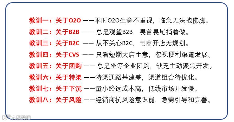 经过这次疫情,每一位城市经理管辖的市场是否能够抵御风险变成显性问题!要及时汲取教训,引导经销商伙伴逐步将生意模式做轻,非核心的部分要开始相信和采用专业的外包资源,比如仓配和