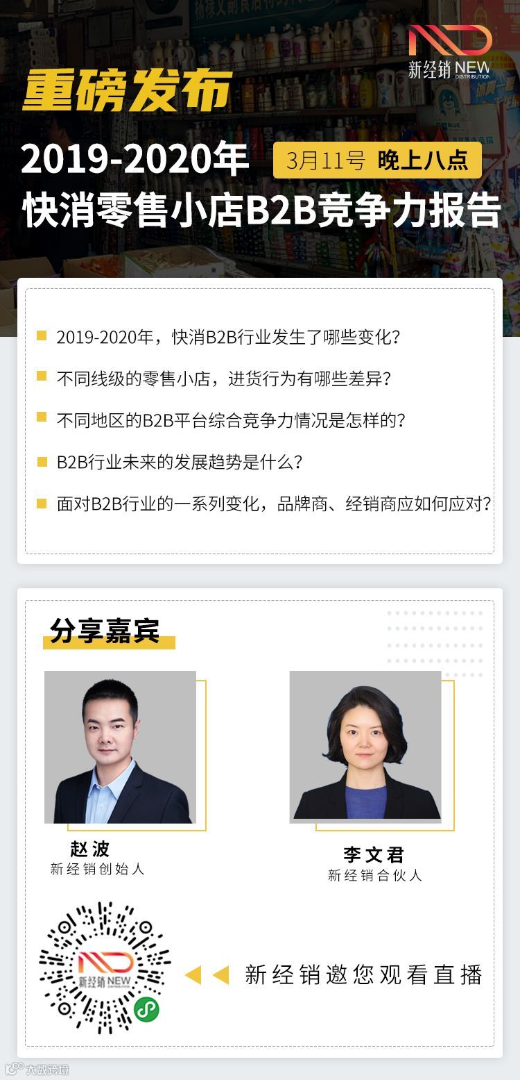 PS:今晚8点,新经销将在微信直播间重磅发布《2019-2020年快消零售小店B2B竞争力报告》!