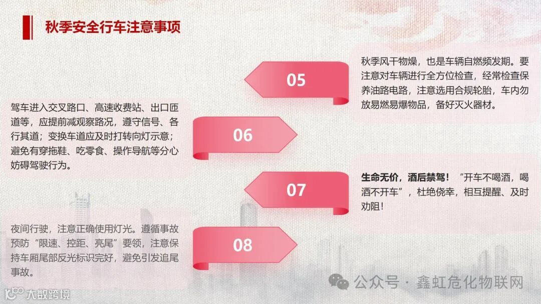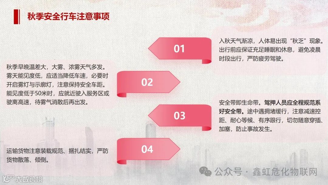 秋天,正逢季节交替,天气干燥,各种安全隐患随之而来。本次培训内容丰富,包括上海市道路运输安全生产治本攻坚三年行动、上海市交通行业重点领域重大事故隐患判定标准、对上月安全生产情况的总结、安全文明驾驶、秋季安全生产注意事项、危险货物道路运输规则、以及如何提升隐患排查治理能力。