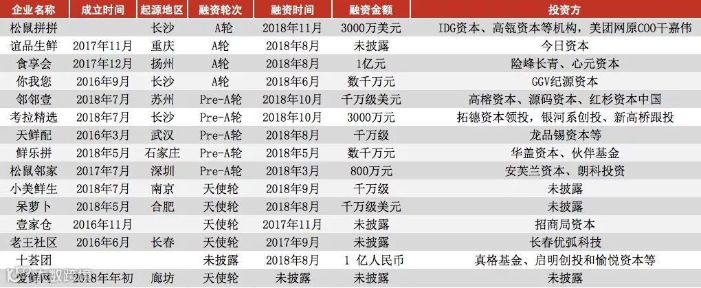 2018年8月至11月,多家社区团购公司宣布获得数千万元以上的融资。同时,腾讯、拼多多、淘宝网旗下的盒马鲜生、每日优鲜、美菜网等一批互联网行业巨头也先后入场。