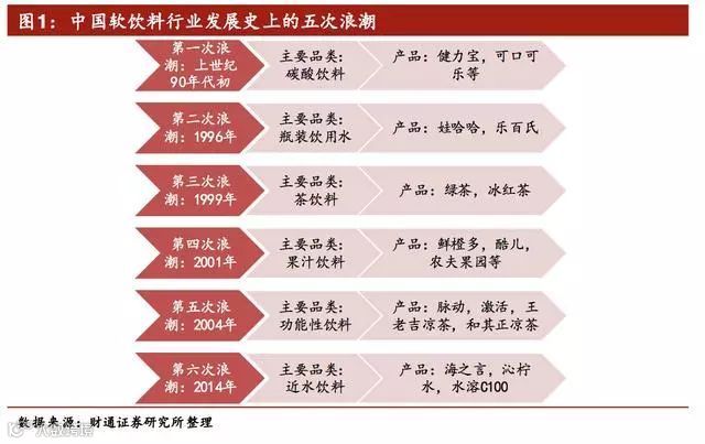 迄今软饮料行业经历了五次浪潮,分别对应碳酸饮料、瓶装饮用水、茶饮料、果汁饮料功能型饮料五大类,每次浪潮后产品品类及规模均迅速提升:可口可乐已经成为现象级的千亿大单品;娃哈哈、农夫山泉均有超百亿级别的单品。