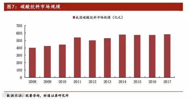 从行业规模来看,我国碳酸饮料市场规模自2012年开始出现下滑,其后增长虽然有所反复,但增速趋缓或停滞已然成为常态。