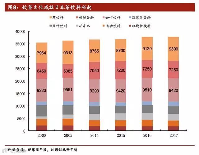 2017年日本茶饮料行业规模达到9,390亿日元(约合人民币600亿),销量高于咖啡饮料及碳酸饮料。