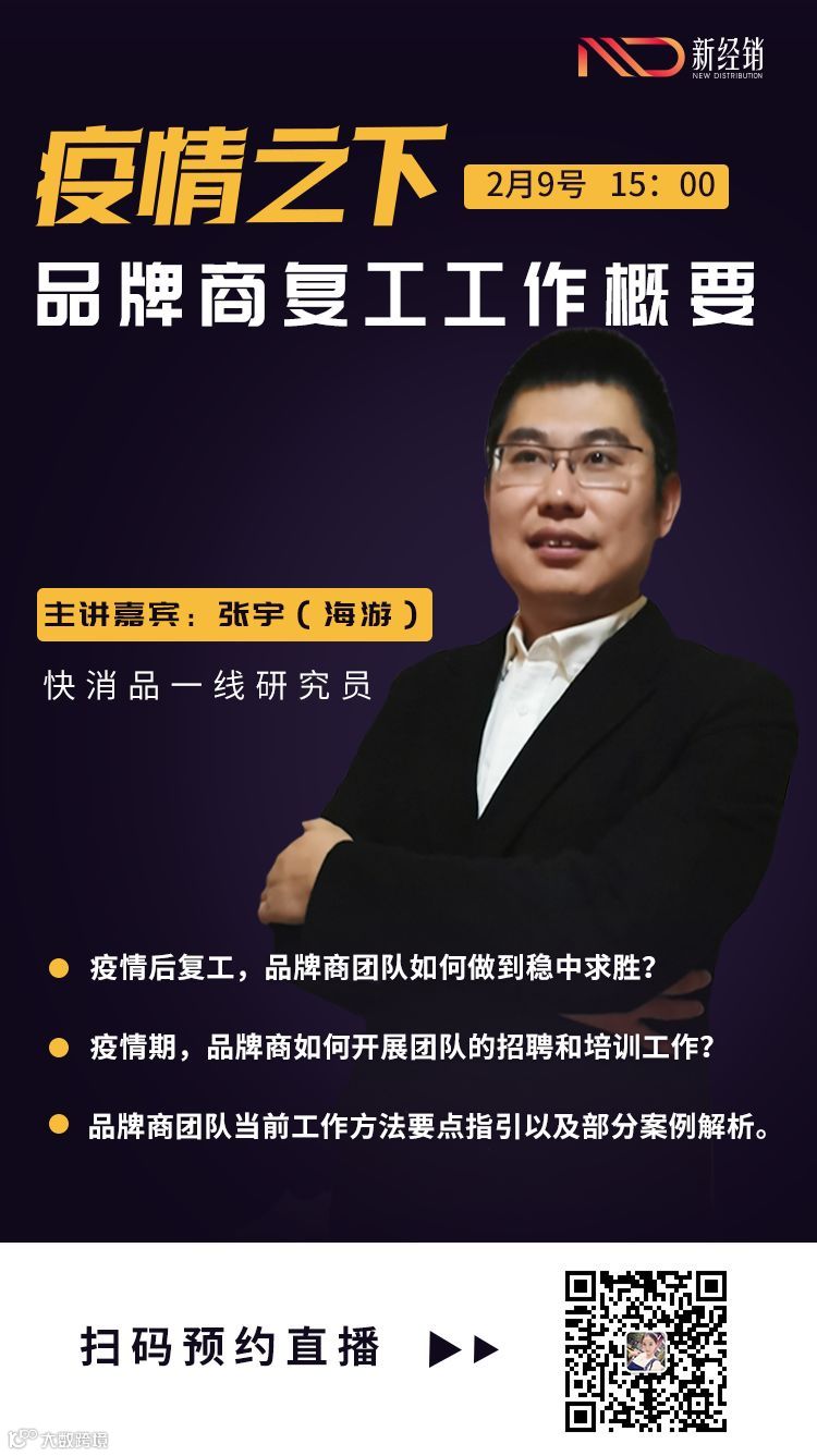 PS:2月9日下午3点,新经销将邀请本篇作者海游(张宇)先生,就疫情下,品牌商复工的团队工作进行系统培训。方式:扫下方海报二维码进直播间