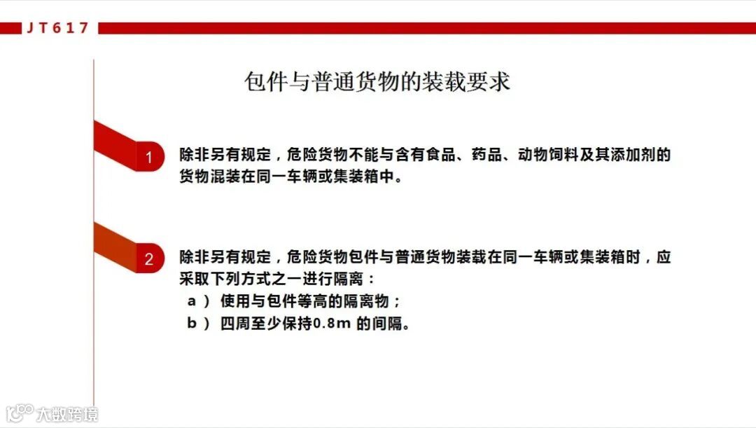 JT617的本部分规定了危险货物道路运输的装卸作业的基本要求,包件运输装卸条件、散装运输装卸条件、罐式运输装卸条件和装卸作业要求。