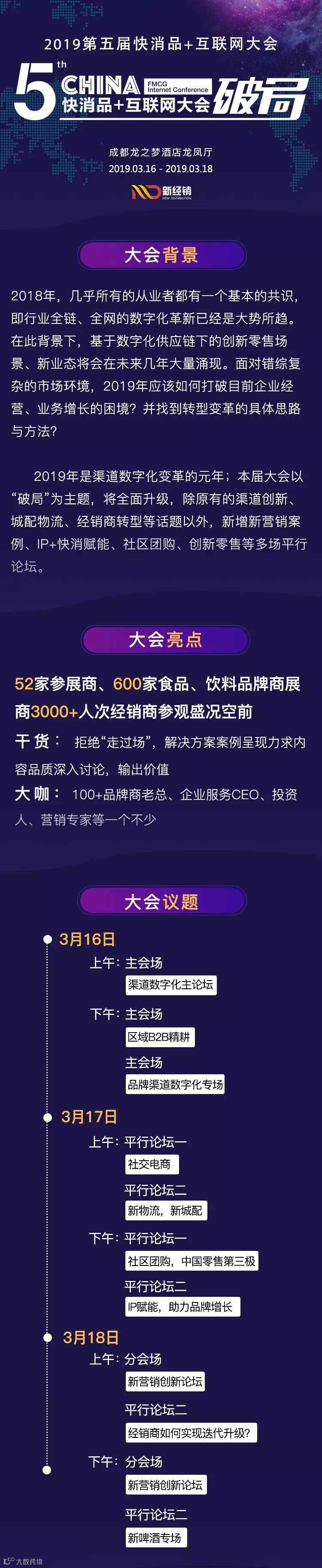 新经销将于3月16日-3月18日成都春季糖酒会期间召开2019年(第五届)快消品+互联网大会。本次会议,我们将围绕“破局”话题,与众多品牌商、供应链服务商、经销商、零售商等展开深入探讨。