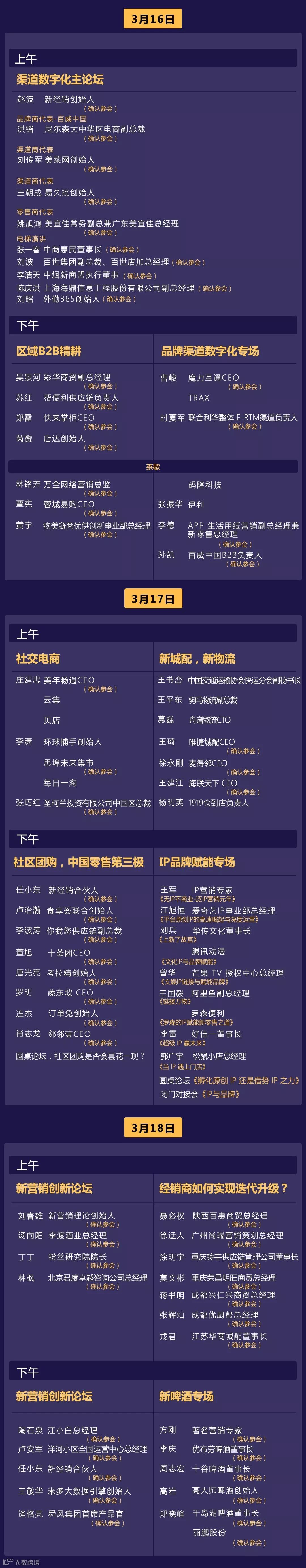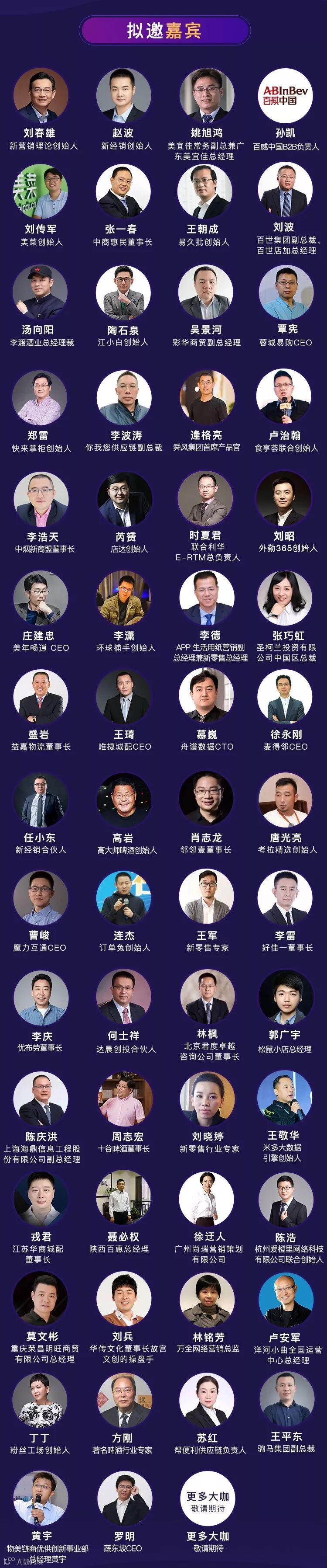 相较于往届会议,本次峰会将全面升级,除原有的渠道创新、城配物流、经销商转型等话题以外,还新增了新营销案例、IP+快消赋能、社区团购、创新零售等多场平行论坛,通过三天十场高密度高质量的专家分享交流,相信每个品牌商、经销商都能够学习到最新的商业模式,专家观点,落地的方法,为自身2019年破局找到新工具和方法,重回高速增长的轨道。