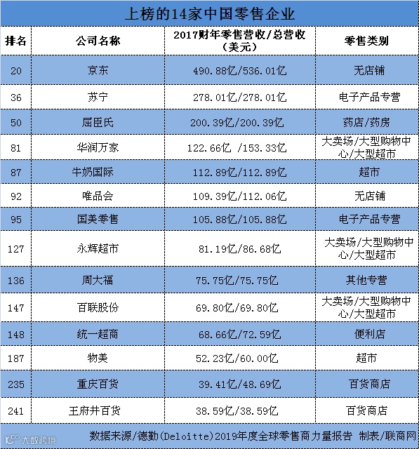 德勤(Deloitte)根据2017财年(截至2018年6月的财政年度)全球各大零售商公开的数据,发布2019年度全球零售商力量报告(Global Powers of Retailing 2019)。