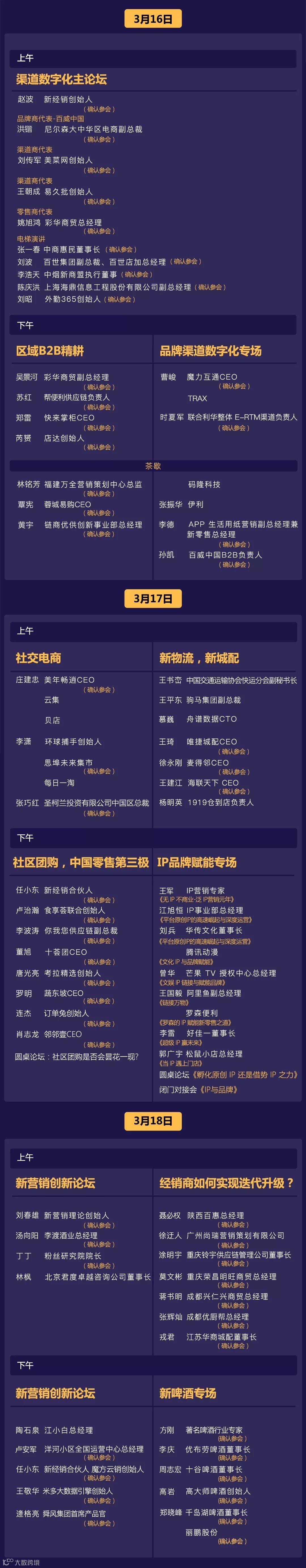 相较于往届会议,本次峰会将全面升级,除原有的渠道创新、城配物流、经销商转型等话题以外,还新增了新营销案例、IP+快消赋能、社区团购、创新零售等多场平行论坛,通过三天十场高密度高质量的专家分享交流,相信每个品牌商、经销商都能够学习到最新的商业模式,专家观点,落地的方法,为自身2019年破局找到新工具和方法,重回高速增长的轨道。