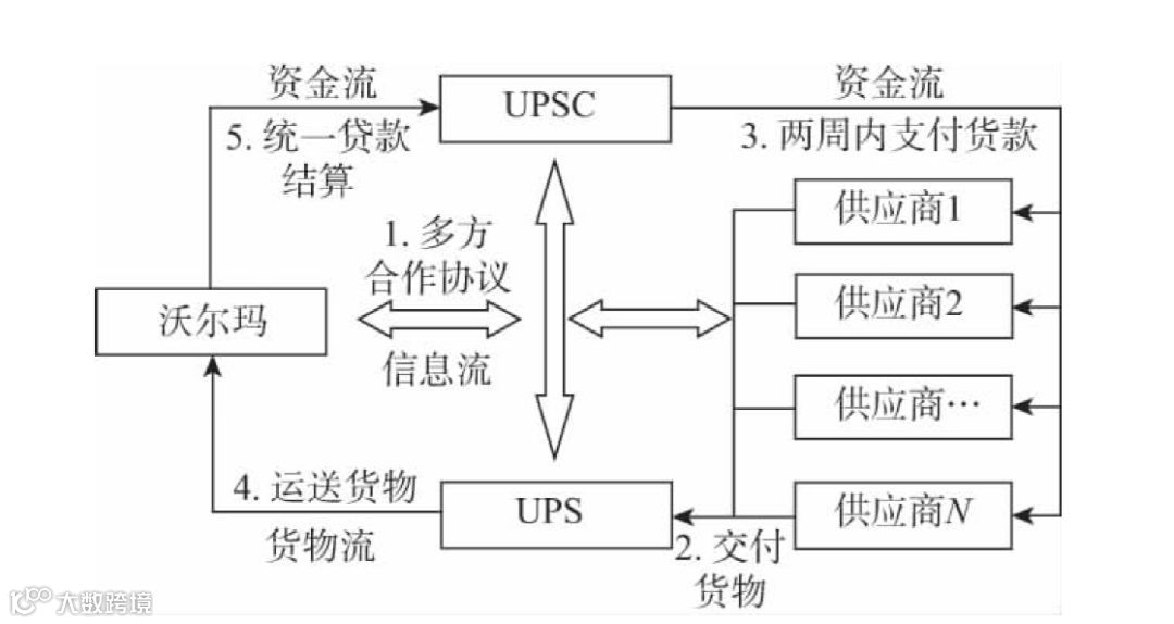 美国的供应链金融产生于19世纪末,第一阶段为商业银行主导,然而信息不对称导致银行无法把控企业风险,企业也无法自由选择银行,这个阶段的供应链金融依然处于不完善的状态。第二阶段则是核心企业主导的供应链金融,包括企业集团合作模式、物流企业主导模式等。典型案例则是美国联合包裹服务公司UPS,其作为物流企业发现零售商沃尔玛会要求东南亚的供应商先行垫付全额货款,结清需要等到到货后30-90日,较长的账期与高额的垫付资金使得小供应商无法进入市场。UPS利用其提供物流服务获取的交易信息,以及自身庞大的资金体量作为基础,成为中间结算商为沃尔玛与供应商提物流、贷款、结算服务。