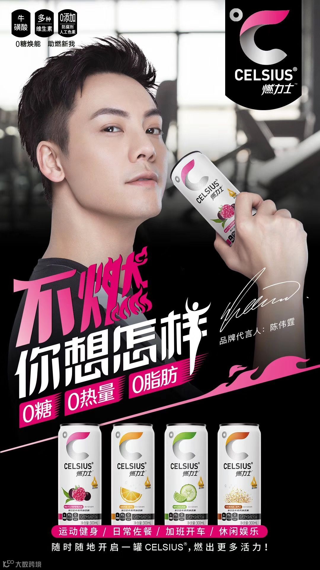 今夏,健康饮料品牌CELSIUS燃力士正式宣布,中国香港知名演员、歌手陈伟霆出任其品牌代言人。这是燃力士进入中国市场一年多以来,首次启用明星担任品牌代言人。