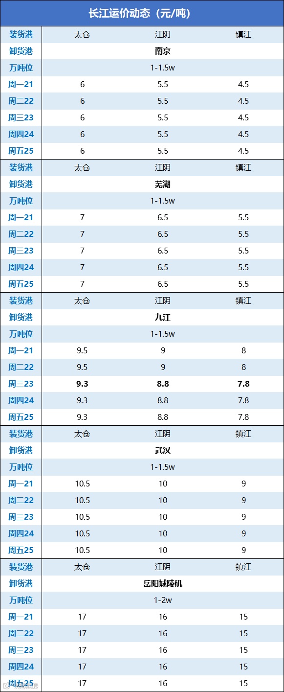 周五镇江到淮安单机1-2千吨的运价为12元/吨,2-3千吨的运价为10元/吨,拖队8-10千吨的运价为11元/吨;