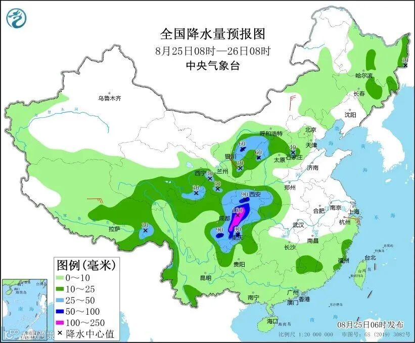 预计,8月25日08时至26日08时,内蒙古河套地区、甘肃东部、宁夏、陕西东北部和南部、青海东部、四川中东部、贵州西北部等地部分地区有大到暴雨,其中,四川盆地东北部、重庆西部等地部分地区有大暴雨(100~180毫米)(见图1)。上述部分地区伴有短时强降水(最大小时降雨量20~40毫米,局地可超过60毫米),局地有雷暴大风等强对流天气。中央气象台8月25日06时继续发布暴雨蓝色预警。
