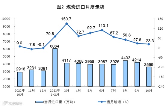 原煤生产增速加快,进口较快增长。10月份,生产原煤3.9亿吨,同比增长3.8%,增速比9月份加快3.4个百分点,日均产量1254.0万吨。进口煤炭3599万吨,同比增长23.3%,增速比9月份回落4.5个百分点。